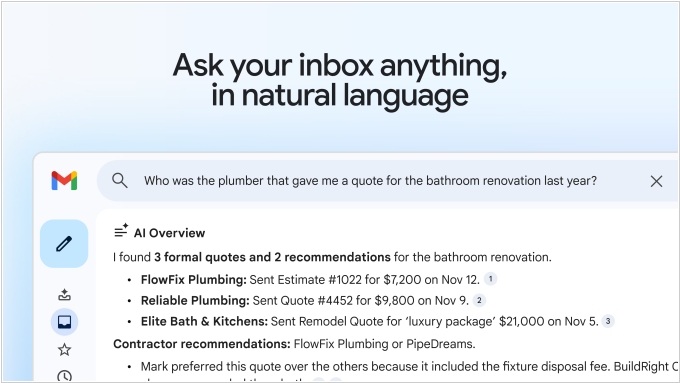 В GMail появился новый режим ИИ-инбокса, который позволяет "разговаривать со своим почтовым ящиком". Он расположен в отдельной вкладке и имеет два раздела: «Предложенные задачи» и «Темы для проверки». В первом разделе отображаются сводки наиболее важных писем, требующих действий, например, напоминание о том, что завтра нужно оплатить счет, или о необходимости позвонить своему дерматологу, чтобы подтвердить почтовый адрес для отправки рецепта. В разделе «Темы для проверки» вы увидите такие обновления, как "Ваш заказ футболок доставлен" и "Ваш годовой отчет теперь доступен в Wealthfront". Gmail также добавил обзоры ИИ в поиске: пользователи теперь могут искать в своем почтовом ящике, используя вопросы на естественном языке. Также появилась функция умной проверки орфографии, аналогичная Grammarly.