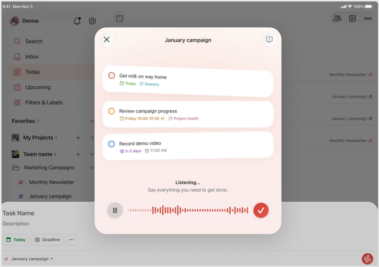 Приложение Todoist теперь позволяет добавлять задачи, используя устную речь. Новая функция называется Todoist Ramble. Вы просто нажимаете на кнопку и описываете новую задачу (или задачи) вслух на естественном языке и Ramble превращает вашу бессвязную речь в организованные задачи. Приложение будет фиксировать упомянутые вами детали, такие как сроки выполнения проекта, приоритеты, продолжительность и ответственные лица. Например, вы можете говорить такие фразы, как «На самом деле, пусть это будет в четверг» или «Вот и все», чтобы направлять ИИ дальше по мере того, как вы говорите. Это удобно если, находясь в пути, вам нужно сделать заметку или поставить задачу, а печатать на ходу сложно. Ramble построен на основе Google Gemini и Vertex AI - движка для понимания устной речи в реальном времени. Аудио не хранится и не используется для обучения ИИ, и приложение сертифицировано по стандарту SOC2 Type II, сообщает компания Doist.