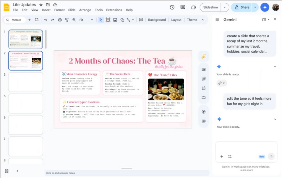 Google добавил еще несколько ИИ функций в свой офисный пакет Workspace. В Docs теперь можно попросить Gemini просмотреть письма в Gmail, GDrive и Chat и извлечь из них необходимую информацию для нового документа, типа: «составь информационный бюллетень для нашей ассоциации домовладельцев, используя протокол собрания моего январского собрания и список предстоящих мероприятий». В Google Sheets теперь можно создавать электронные таблицы, которые тоже извлекают данные из электронной почты, чатов и Google Drive: «Организуй мой предстоящий переезд в Чикаго. Составь контрольный список для упаковки вещей по комнатам, список контактов коммунальных служб и электронную таблицу для отслеживания предложений от транспортных компаний из моей почты». В Google Slides таким же образом можно просить Gemini создавать новые слайды на основе вашего контекста.