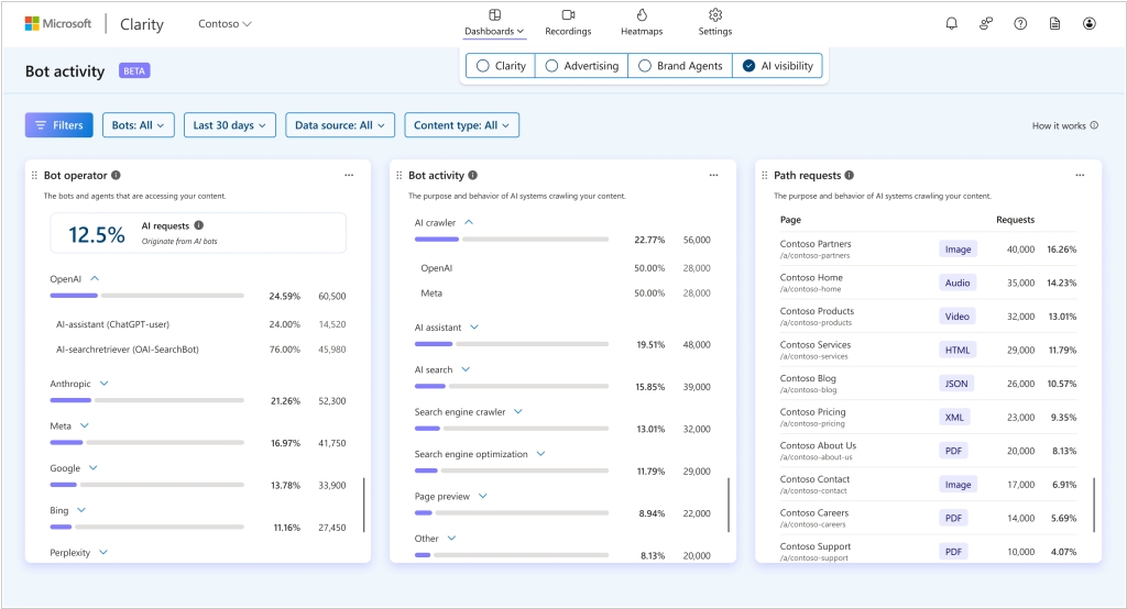 В системе веб-аналитики Microsoft Clarity появился раздел AI Bot Activity. Сканирование сайта ботами часто является сигналом того, что контент может быть позже использован ИИ моделями. Новый раздел показывает, как проверенные LLM боты взаимодействуют с вашим контентом. Вы можете увидеть какие платформы ИИ получают доступ к вашему сайту, как часто они сканируют и в каком масштабе, какие страницы, пути и ресурсы привлекают наибольшее автоматизированное внимание. Эти данные помогают превратить трафик ботов из фонового шума в измеримую аудиторию и понять какой контент интересен LLM моделям и в каком направлении следует развивать контентную часть вашего сайта.