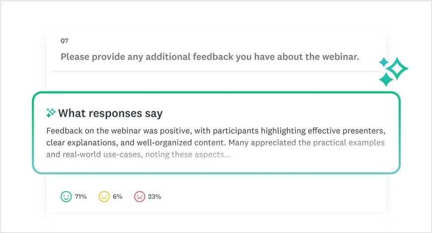 Сервис опросов SurveyMonkey добавил AI-инструмент «Что говорят ответы», который автоматически саммаризирует результаты открытых вопросов, так что вы можете получить быстрый краткий обзор наиболее частых ответов. Вместо того чтобы копаться в строках необработанных ответов, вы можете положиться на ИИ, который не только обобщает но и делает выводы. Анализ настроений и качества ответов теперь включены по умолчанию для всех соответствующих тарифных планов. Также, разработчики обновили интерфейс анализа, который помогает выявлять тенденции и обмениваться визуализациями с вашей командой. Кроме того, они обновили типы вопросов с закрытыми вариантами ответов, заменив таблицы с большим количеством текста на четкие и полезные визуализации для вопросов с множественным выбором, индекса лояльности клиентов и матричных вопросов.