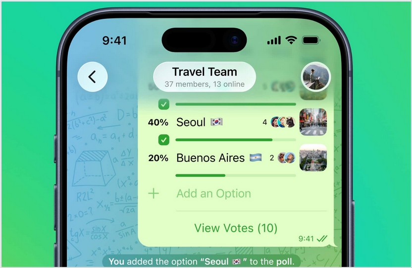 В обновлении Telegram появилось множество новых функций для опросов, которые можно использовать для организации опросов сотрудников и клиентов. Теперь Вы можете прикреплять медиафайлы или геопозицию к вопросам и вариантам ответов, добавлять описание для дополнительного контекста, разрешать пользователям добавлять свои варианты к активным опросам, включать отображение проголосовавших рядом с каждым вариантом, отключать возможность переголосовать для точности результатов, перемешивать порядок вариантов для разных пользователей, ограничивать срок проведения опроса, скрывать результаты до истечения срока опроса, просматривать результаты без голосования, если опрос создан Вами. Если Вы создадите в групповом чате опрос с отображением голосов, Вам будут приходить уведомления о каждом ответе с указанием выбранного варианта.