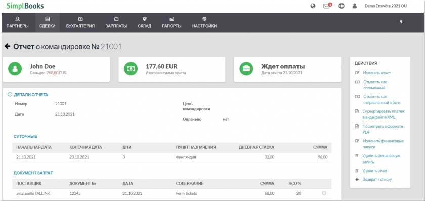 В эстонской облачной бухгалтерии SimplBooks появилась возможность вводить отчеты о командировке. Это удобный способ ввода суточных, связанных с командировкой, а также других расходных документов, также связанных с командировкой, аналогично отчету о расходах. Также появились отчеты о расходах для подотчетных лиц. Отчеты о расходах используются, когда владелец бизнеса, член правления или сотрудник совершает покупки от имени предприятия на свои личные средства. Можно удобно вносить такие чеки как отчеты о расходах и на основе этого можно компенсировать себе эти затраты со счета предприятия. Подотчетным лицом может быть любой сотрудник компании. Аналогично отчетам о командировке, в SimplBooks можно вносить связанные с поездками расходы. Текущая ставка, не облагаемая налогом, в Эстонии составляет 335 евро за календарный месяц. Основанием для возмещения является тот же дневник поездок.
