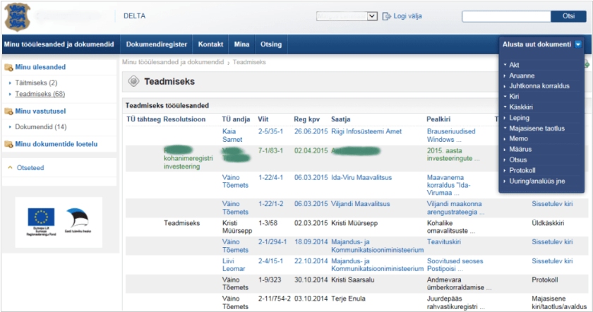 Эстонская компания Krabu Grupp создала систему управления документами Delta – онлайн-приложение на платформе Alfresco, которое позволяет управлять документооборотом в масштабе всей организации. Функциональность включает реестр документов, регистрацию документов, рабочие задачи, делопроизводство, цифровую подпись с ID-картой и Mobile-ID, функциональность заместителя, система прав пользователя, публичный реестр документов (ADR). В системе Delta можно назначать и отслеживать рабочие задачи, управлять ими, а также выполнять действия в качестве заместителя. Система прав доступа может быть гибко настроена как для внутренних нужд, так и для внешних партнеров. По данным самой компании, систему Delta использует примерно 20 тысяч пользователей.