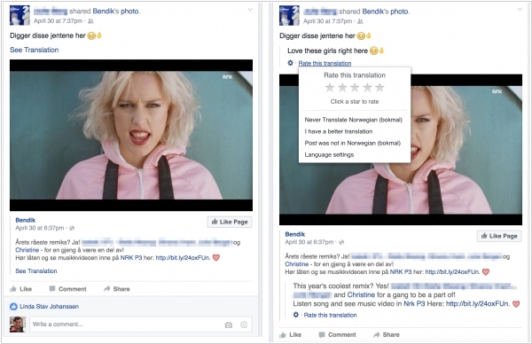 Facebook уже несколько лет предоставляет возможность перевода постов на ваш язык. До сих пор эта функция осуществлялась с помощью майкрософтовского переводчика Bing Translator, но в Facebook решили от него отказаться и разработали свой. Говорят, что Bing подходит для официальных текстов, но плохо справляется с обычными человеческими писаками, наполненными ошибками и фразеологизмами. Очевидно, для обучения переводчика Facebook использует свою огромную базу сообщений пользователей, т.е. все что вы пишите на Фейсбуке может быть использовано в качестве перевода других постов.