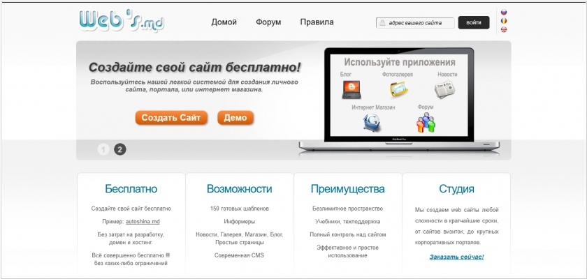 В Молдове появился собственный сервис для создания сайтов - Webs.md. Пока он бесплатный и без каких-либо ограничений (даже по доступному пространству). При этом он предоставляет современную CMS, 150 готовых шаблонов, блоки Новости, Галерея, Магазин, Блог, Простые страницы. Зарабатывать разработчики пока планируют на создании более сложных проектов, в случае, когда клиентам не будет хватать возможностей конструктора.