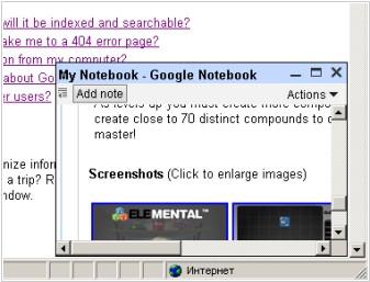 Google выкатил ещё один очень интересный сервис, Google Notebook. Под словом Notebook здесь понимается вовсе не портативный компьютер, а онлайновая записная книжка, которая может работать сама по себе или как подключаемый модуль к браузеру. Установив его, можно увидеть новую иконку в статусной строке браузера, а кликнув на ней - окно с кнопкой Add Note и полем для заметок. Однако заметки добавлять нужно вовсе не вручную, а копируя с открытой в текущий момент страницы. Достаточно выделить фрагмент документа (можно с картинками и сложным форматированием) и нажать "Add Note". Текст и ссылка на ресурс скопируются и добавятся в список заметок. В онлайновой части сервиса представлены куда большие возможности по работе с записями. С сохранёнными данными разрешают играться как угодно: перетаскивать, меняя местами, редактировать, перебрасывать между разделами.