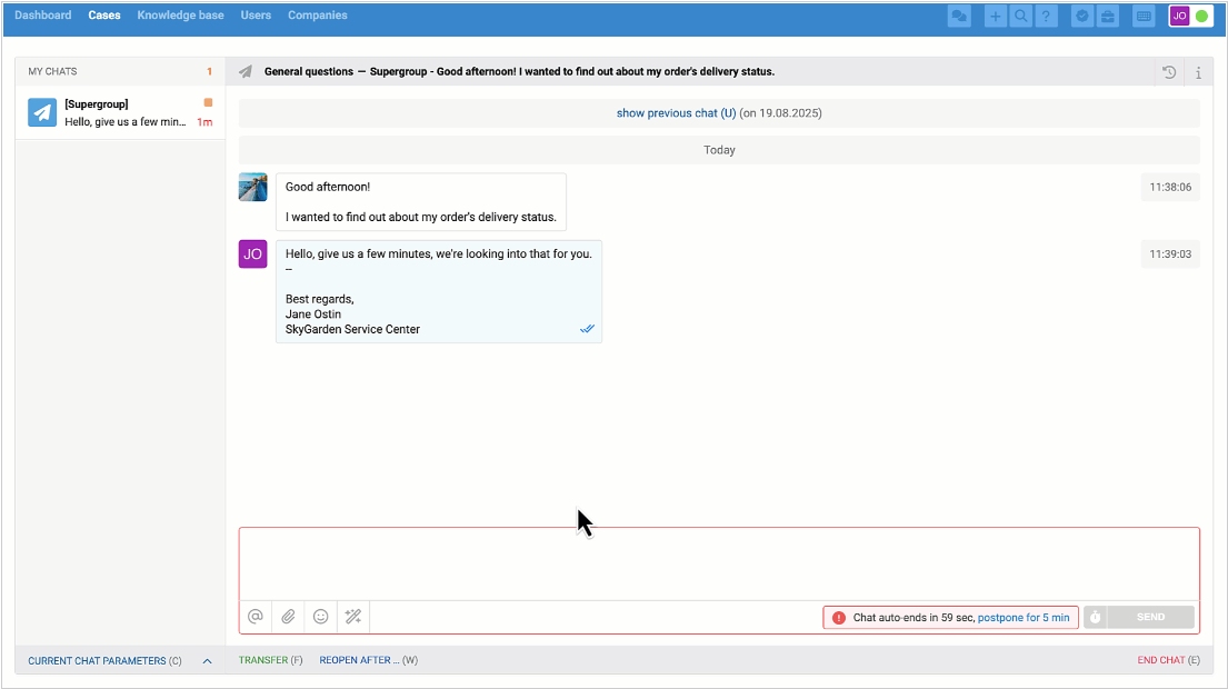 Активные чаты в Deskie отображаются в отдельном интерфейсе, доступном через значок чата в правом верхнем углу учетной записи агента. Чаты автоматически завершаются по истечении заданного в настройках периода ожидания. После завершения чаты перемещаются в список всех обращений, и любое новое сообщение от пользователя или агента будет их повторно активировать. Ранее чаты могли автоматически завершаться без какого-либо видимого уведомления — даже если агент продолжал над ними работать, например, готовил ответ или одновременно общался с другим клиентом. В таких ситуациях агенту приходилось переходить в список всех обращений, находить соответствующее обращение рядом с чатом со статусом «открыто» и отправлять ответ, чтобы продолжить разговор. Теперь Deskie будет заранее предупреждать о предстоящем автоматическом завершении активного чата и предлагать возможность оставить его активным.