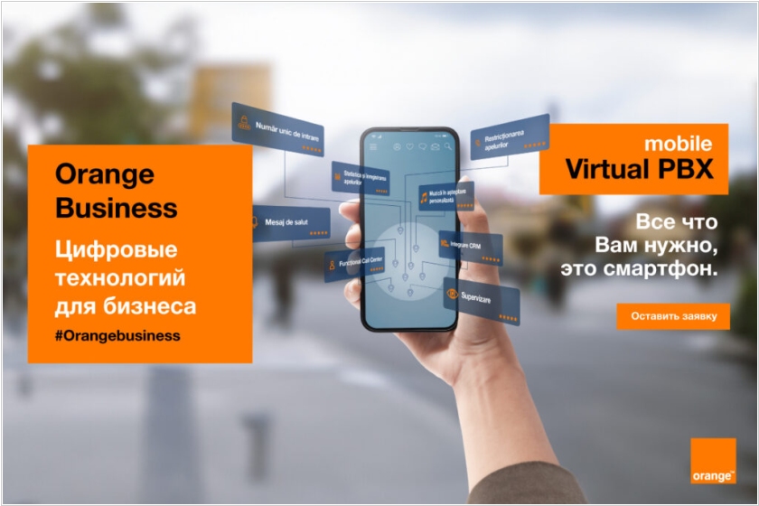 Orange Moldova запустил новую услугу умной телефонии - Orange Mobile PBX, которая позволяет бизнесу эффективнее общаться с клиентами. Это современная мобильная платформа, которая работает в мобильном приложении, предоставляет единый входящий номер (мультилайн), статистику и запись звонков, возможность записать приветственное сообщение, персонализированную музыку для периода ожидания, возможность автоматически отклонять звонки c определенных номеров, возможность подключения третьего лица в текущий разговор со своего устройства, функционал для Call Center (путем формирования очереди звонки переадресованы компетентному отделу посредством алгоритма). Виртуальная АТС может быть интегрирована с приложением типа CRM посредством API интерфейса.