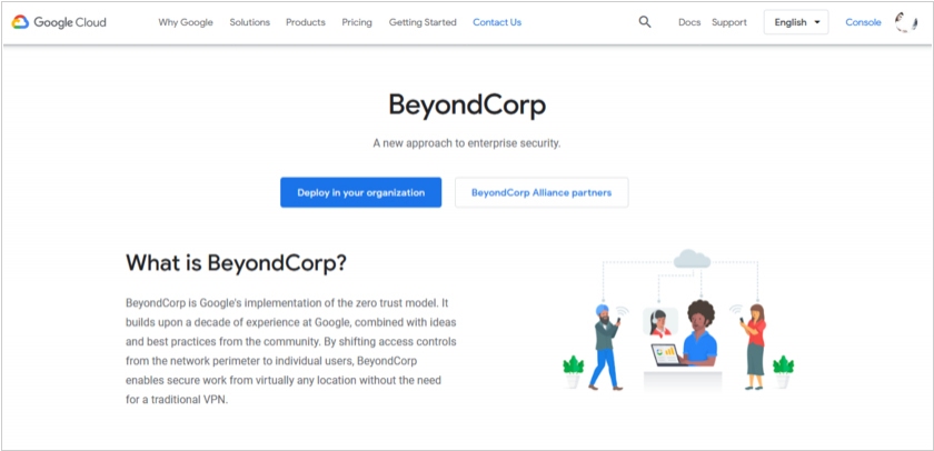 Google открыл для всех желающих компаний сервис Beyondcorp. Он позволяет сотрудникам получать безопасный доступ к внутренним веб-ресурсам организации (интранету) из любого места и с использованием любого устройства и без использования VPN (Virtual Private Network – «виртуальная частная сеть»). Beyondcorp Remote Access пропускает весь внешний трафик через прокси-сервер с целью идентификации пользователей и определения их привилегий. При этом система полагается не только на проверку личности сотрудника, но и так называемого контекста доступа. Сервис можно применять вне зависимости от того, где развернуты приложения организации – в частном облаке Google, облаке другого провайдера или на базе собственной инфраструктуры (on-premise). Преимущество данного сервиса над VPN - в простоте развертывания и в возможности быстрого предоставления доступа к своим ресурсам внешним партнерам.