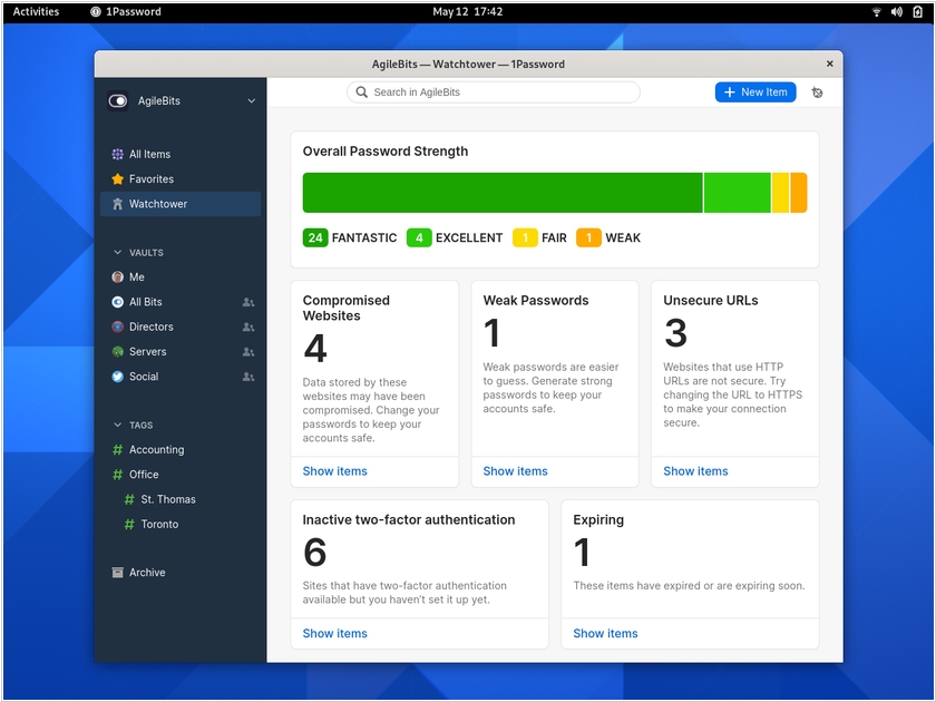 Вышла официальная версия приложения 1Password для Linux. Среди его возможностей: темная тема, работа с сетевыми ресурсами (FTP, SSH, SMB), поддержка значка в области уведомлений, указывающего на то, что программа, хотя её окно и закрыто, разблокирована, открытие браузера, используемого по умолчанию, и ввод в него паролей, интеграция с системой блокировки экрана Linux, поддержка работы в режиме простоя компьютера, защищённые вложенные файлы, возможности по архивированию и удалению объектов, обеспечивающие улучшение организации документов, панель Watchtower, предназначенная для мониторинга и оценки уровня безопасности паролей..