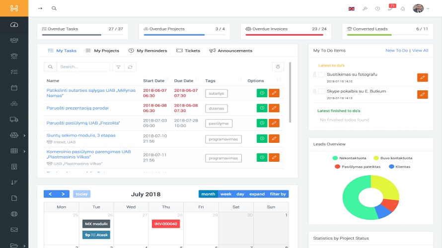Литовская онлайн CRM система с возможностью управления проектами и поддержкой клиентов. Автоматизация email-уведомлений и рассылок. Есть английский и литовский интерфейс.