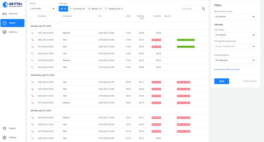 Эстонская виртуальная АТС SkyTel получила интеграцию с системой для организации совместной работы и управления бизнесом Битрикс24. Интеграция поддерживает звонки в один клик из интерфейса Битрикс24 CRM, всплывающие карточки клиентов при входящих звонках, автоматическое создание лидов и сделок при звонках с новых номеров, распределение входящих звонков по ответственным менеджерам в зависимости от звонящего клиента, автоматическую запись звонков в CRM с внесением в карточку клиента, формирование аналитики звонков по каждому сотруднику, отделу, контакту, сделке.
