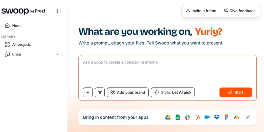 Prezi - сервис презентаций, известный своим оригинальным форматом бесконечного холста. Но теперь, с появлением большого количества AI-генераторов презентаций, в Prezi подумали, почему бы не сделать свой - для обычного формата слайдов (тем более, что есть масса наработок). И сделали Swoop. Фактически это AI-чат, который подключается к вашим приложениям (Google Drive, Dropbox, Slack, Notion, Figma...) и в режиме диалога помогает выстроить структуру презентации, придумать контент и, в итоге - генерирует слайды с использованием вашего фирменного стиля (берет его с сайта или загруженных документов). Кроме того, вы можете загрузить существующую презентацию PowerPoint или Google Slides, и Swoop сделает ее более профессиональной. Результат можно экспортировать в PowerPoint, PDF или в виде ссылки для онлайн доступа. Swoop бесплатен для начала работы (видимо, оплату потребуют когда вы превысите лимиты токенов).